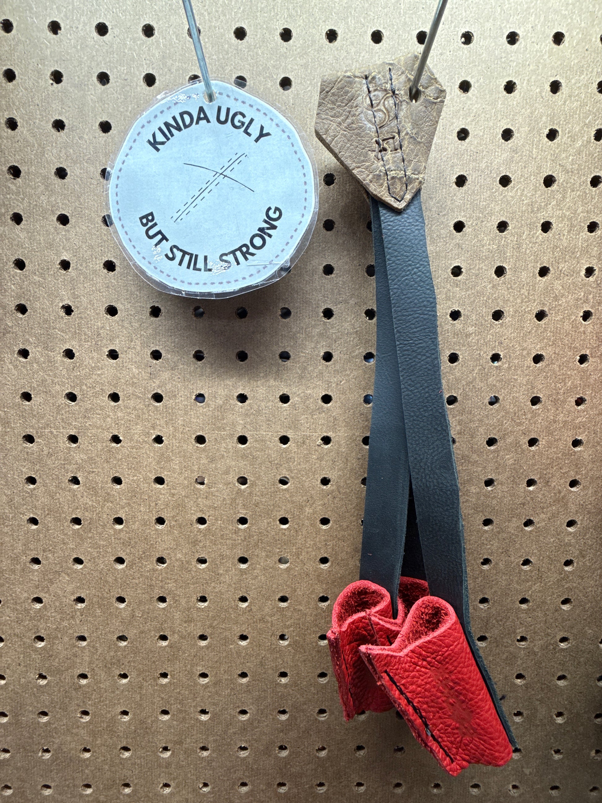 2mm bright red, black and tan leather. Finger straps are not perfect cuts, wobbly lines. Pommel also has a lot of scarring.