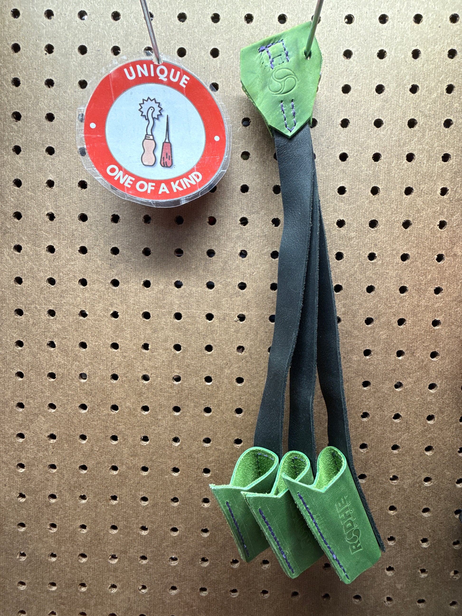 2mm black straps with 1.5mm green leather. Purple stitching and Halloween theme stamps.