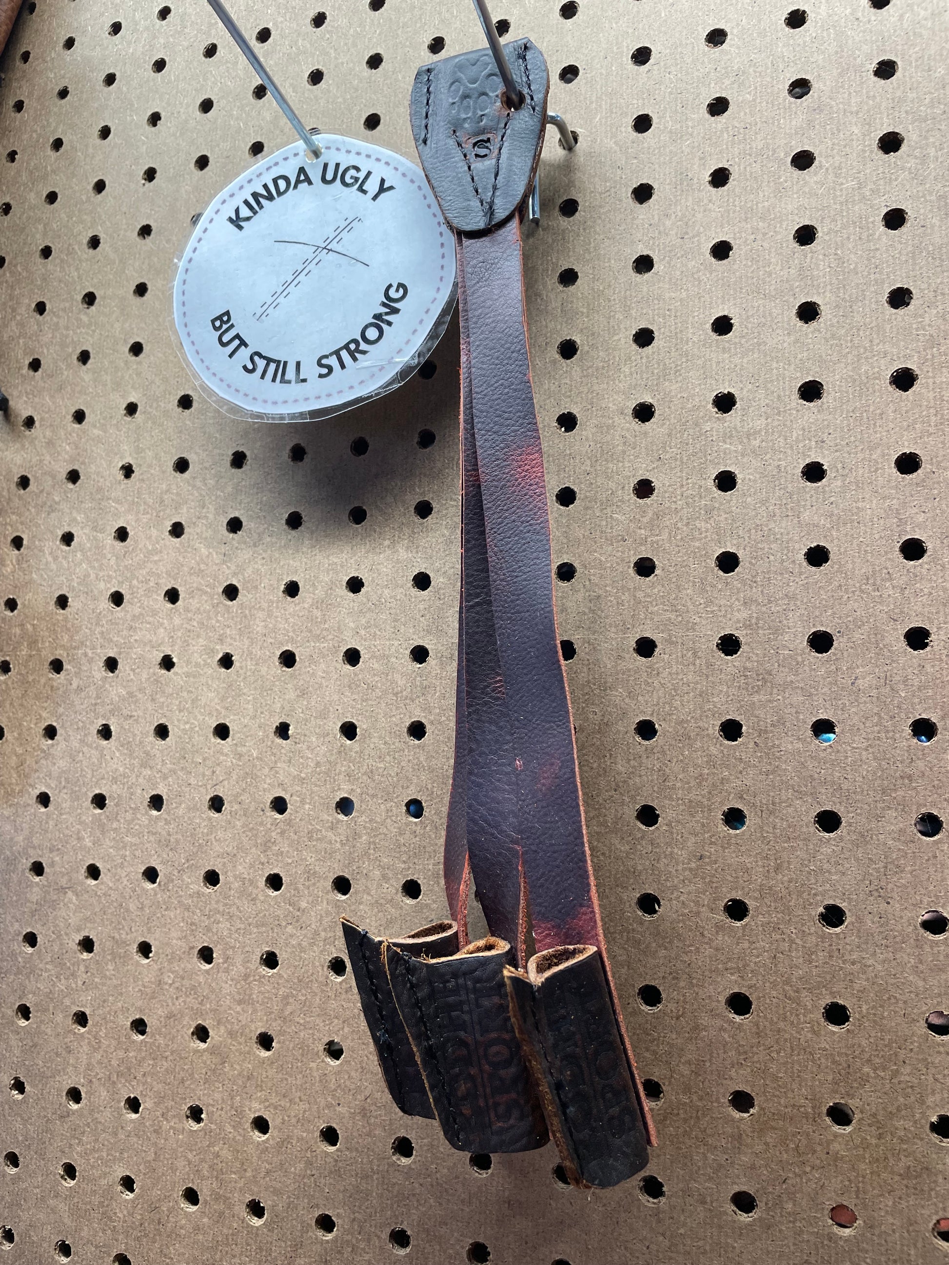 This old wolf paw design is pure nostalgia for us. Dragon fingers are designed to work with our Rodhe Strap (not included) to protect your hand as you toss iron. Size small crafted with 2mm brown and red extra long straps. Three available.