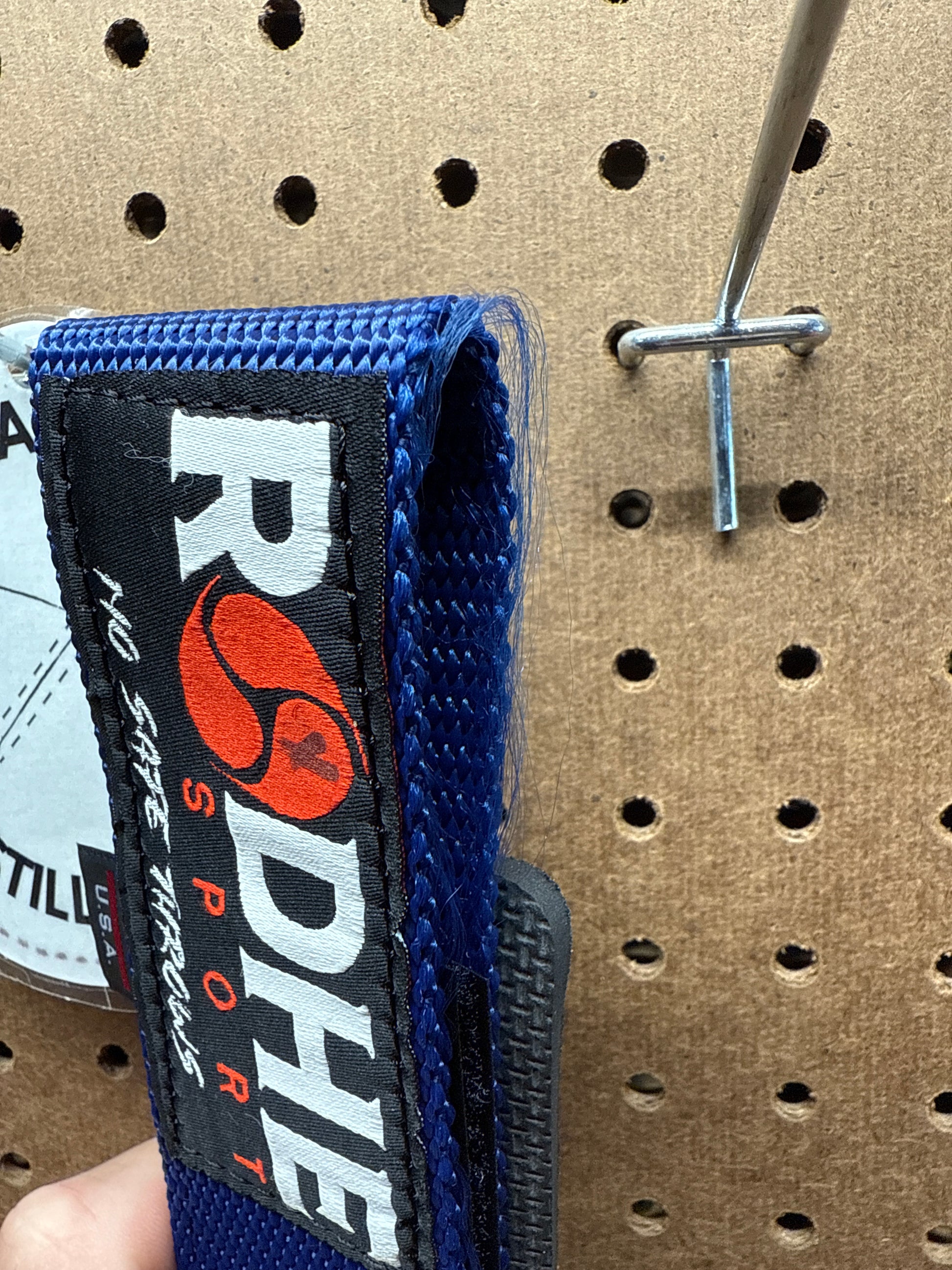 Navy blue with factory defect in webbing weave.